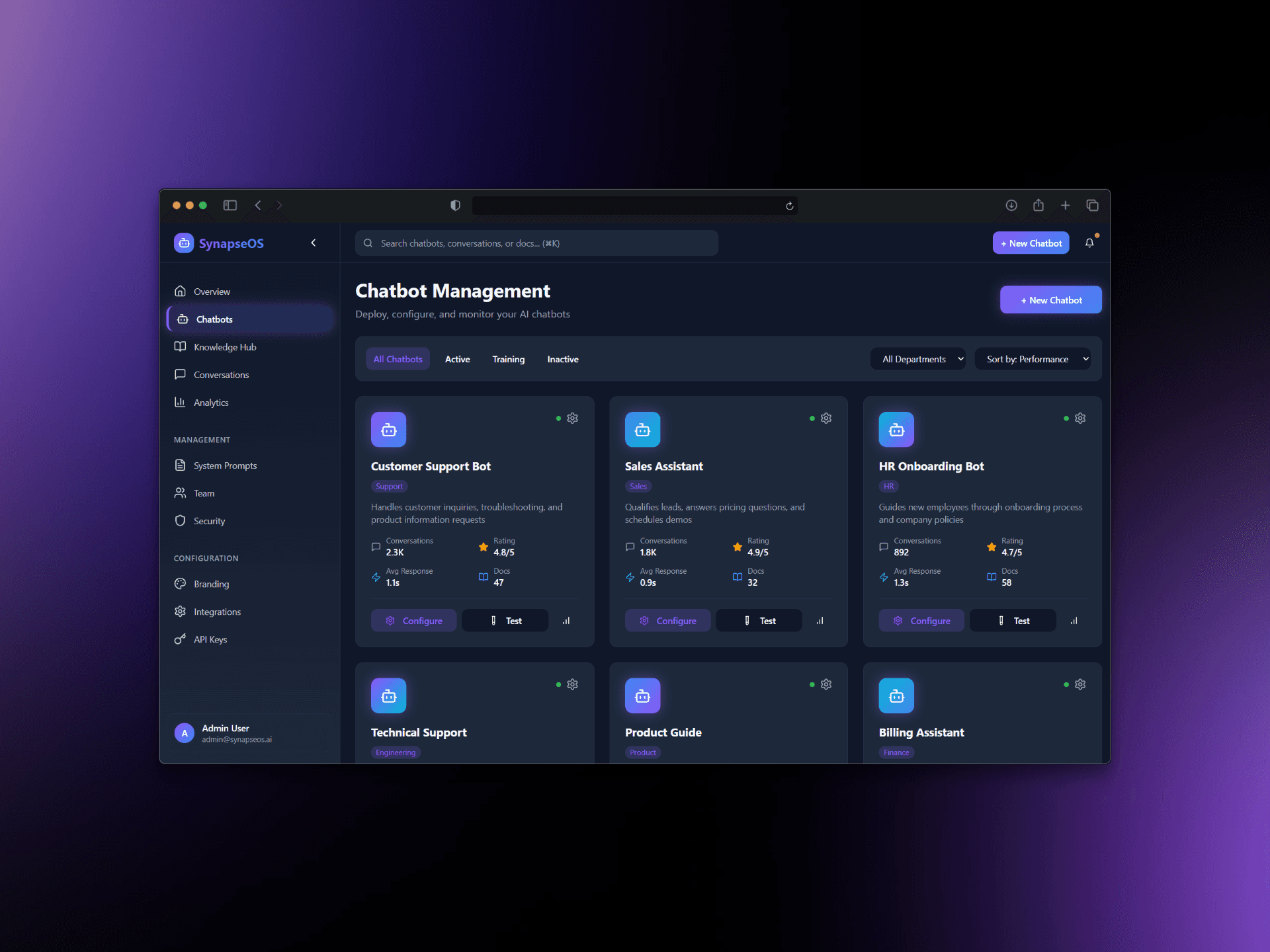 Synapse OS is a scalable platform that allows organizations to manage multiple chatbots, their knowledge bases, and custom prompts - all from one intuitive dashboard. It bridges the gap between AI flexibility and enterprise control, making conversational AI deployment effortless and secure.